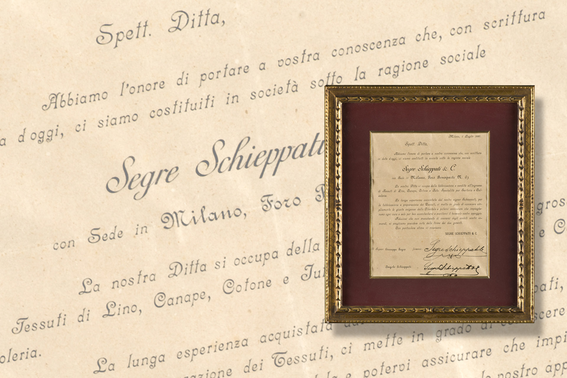 Segre & Schieppati nasce nel 1897 quando il giovane Giuseppe Segre, intraprendente ventiquattrenne impiegato in una filanda milanese sui Navigli, si associa con gli amici Schieppati e Dacono e fonda a Milano una piccola società di tessitura, tintoria e finissaggio.